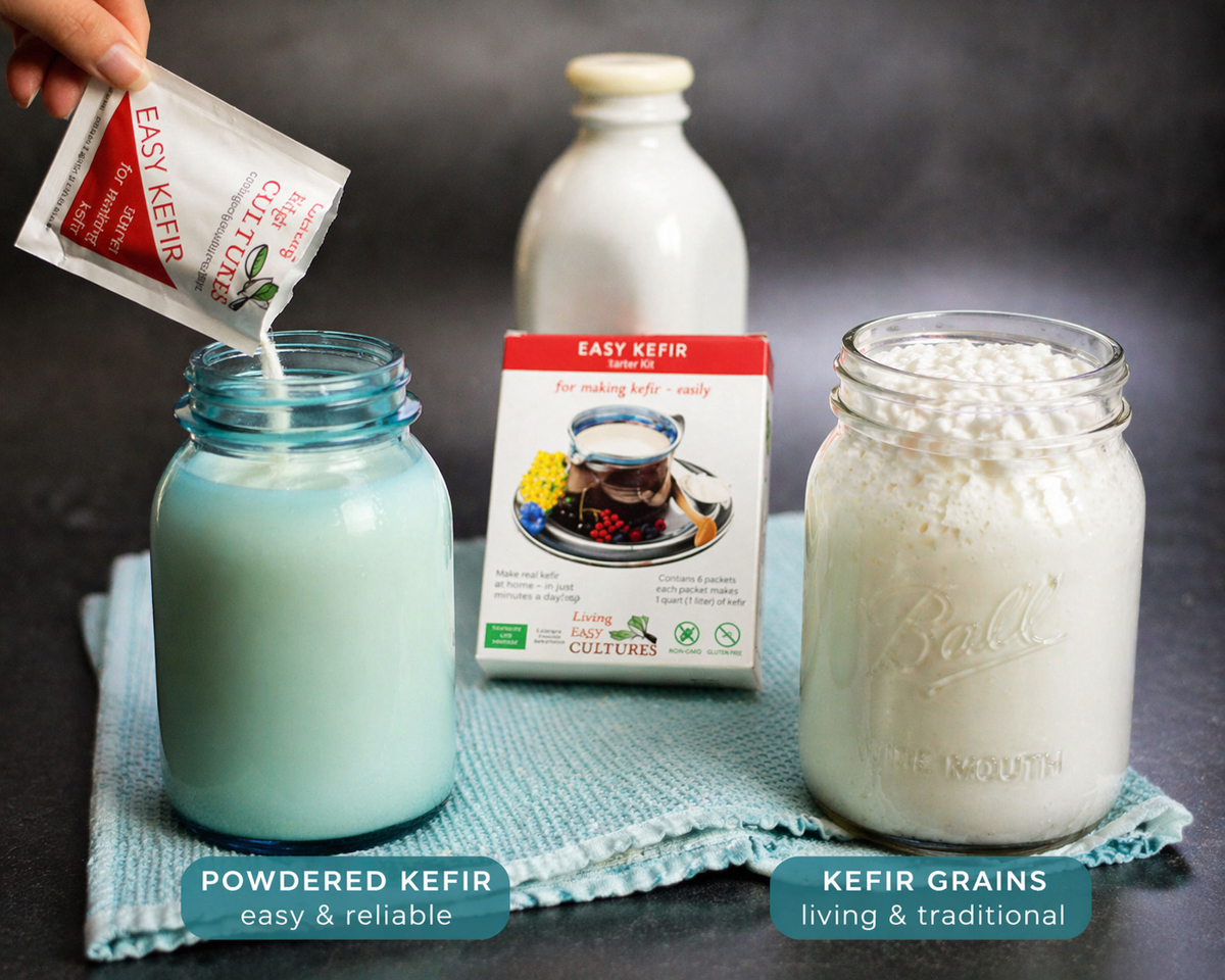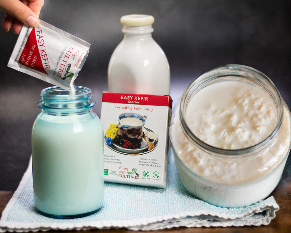 The powdered version is made from flash-frozen kefir cultures, and it can be a wonderful place to begin. It’s easy and reliable, and you can make batch after batch by re-culturing.