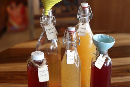 - Fruit juice of your liking: cherry, grape, blueberry, pomegranate, lemon, pineapple, etc. You can add pieces of fruit (strawberries, blueberries, etc.) in addition to, or instead of, fruit juice. Even orange peel is delicious and gives it more fizz. Please note that if you are using fresh raw juice (vs. bottled) the fermentation time will be cut in half. You’ll need to check it often as it can explode!