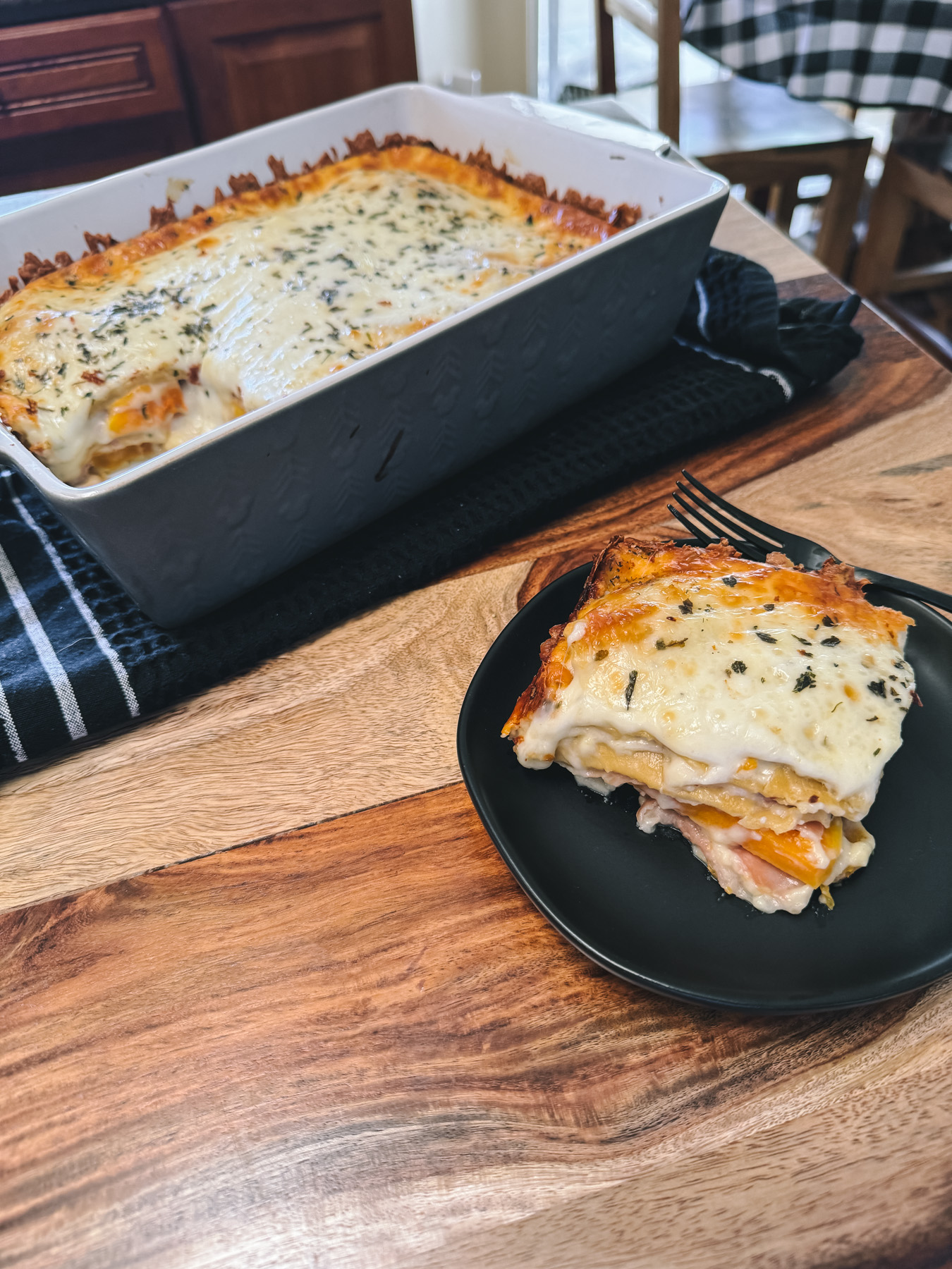 The bechamel sauce and butternut squash pair together beautifully and the prosciutto and herbs make it all come together. People are always surprised by how good this lasagan is and it has the flavors of fall and family!