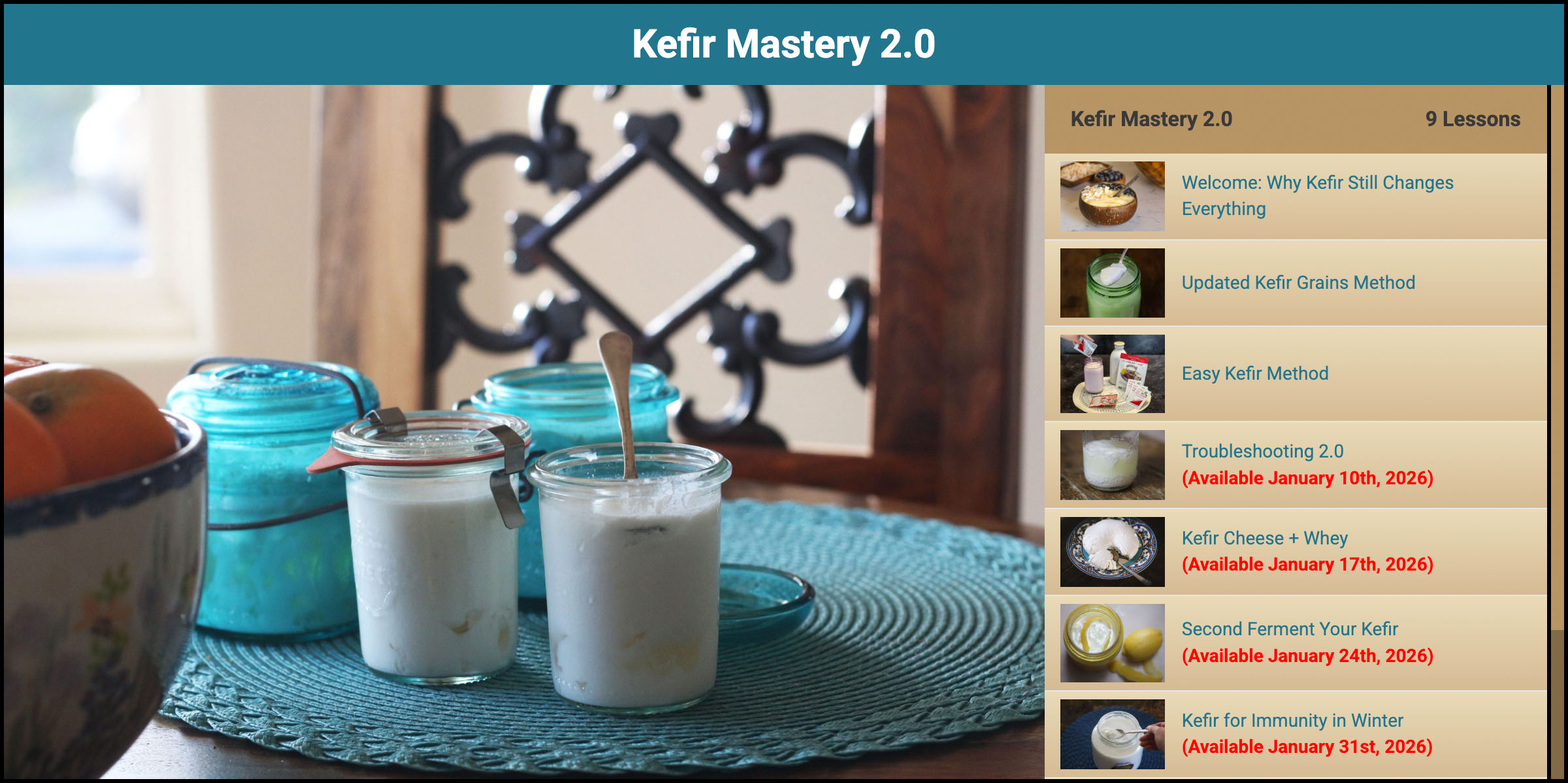 January is one of my favorite times to focus on kefir. After more than 24 years of making and drinking it daily, I created Kefir Mastery to gently guide you through where to start, how to make kefir consistently, and how to use it in simple ways that support digestion, immunity, and balance during the winter months. This course is meant to feel like you’re in my kitchen with me, learning calmly and confidently.